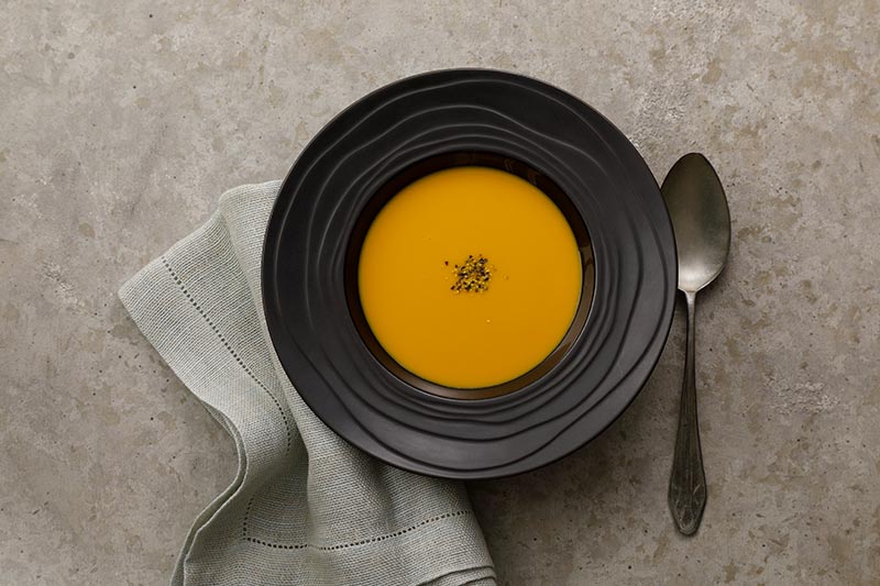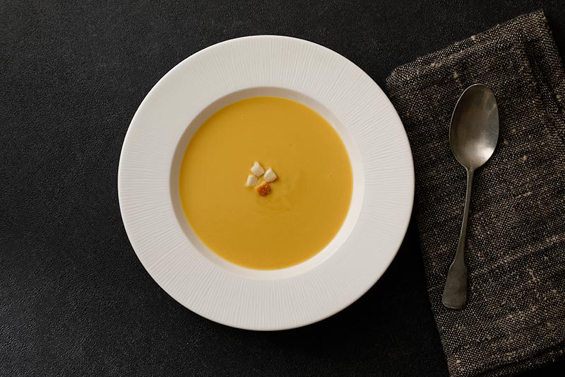 エネルギー151kcal/たんぱく質3.4g/脂質9.4g/炭水化物13.1g/食塩相当量1.0g<パンプキンスープ>