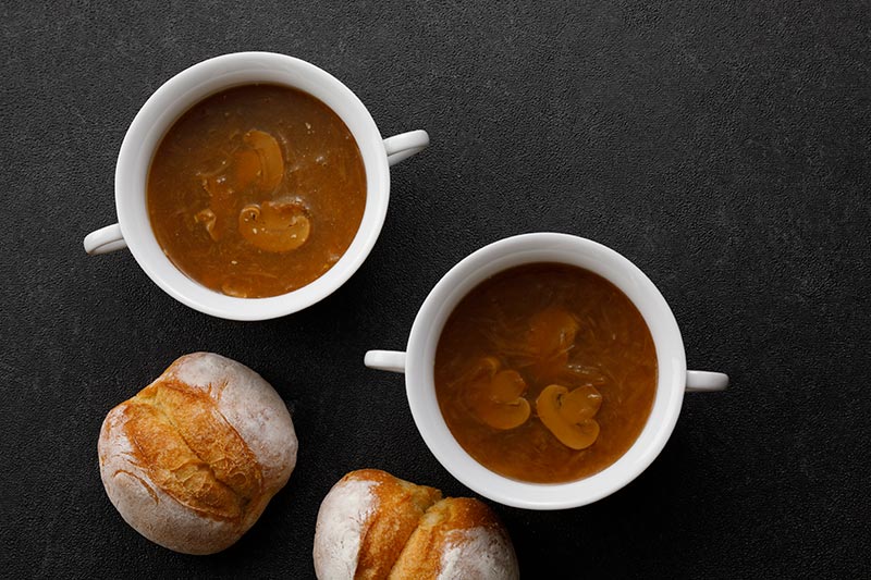 エネルギー179kcal/たんぱく質2.4g/脂質13.6g/炭水化物11.7g/食塩相当量1.2g<オニオンスープ>